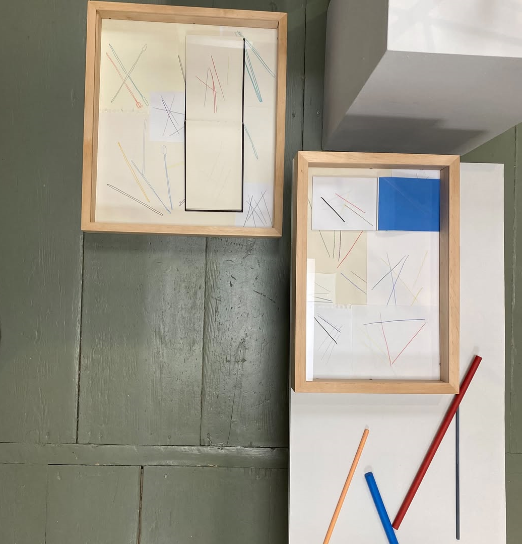 Od 2013 roku tworzę cykl „Bierki”. Mój syn miał wtedy rok. Ja tęskniłam za gestem twórczym. Bierki to moje patyczki– pierwsze znaki, które układałam na podłodze, przenosiłam w rysunek, zamieniając je w abstrakcyjne obrazy. W tej wystawie pokazuję zarówno szkice w gablotach, jak i przestrzenne rzeźby – bierki zbudowane z drewnianych elementów, ustawiłam na postumentach pomiędzy rzeźbami Rząsy.
